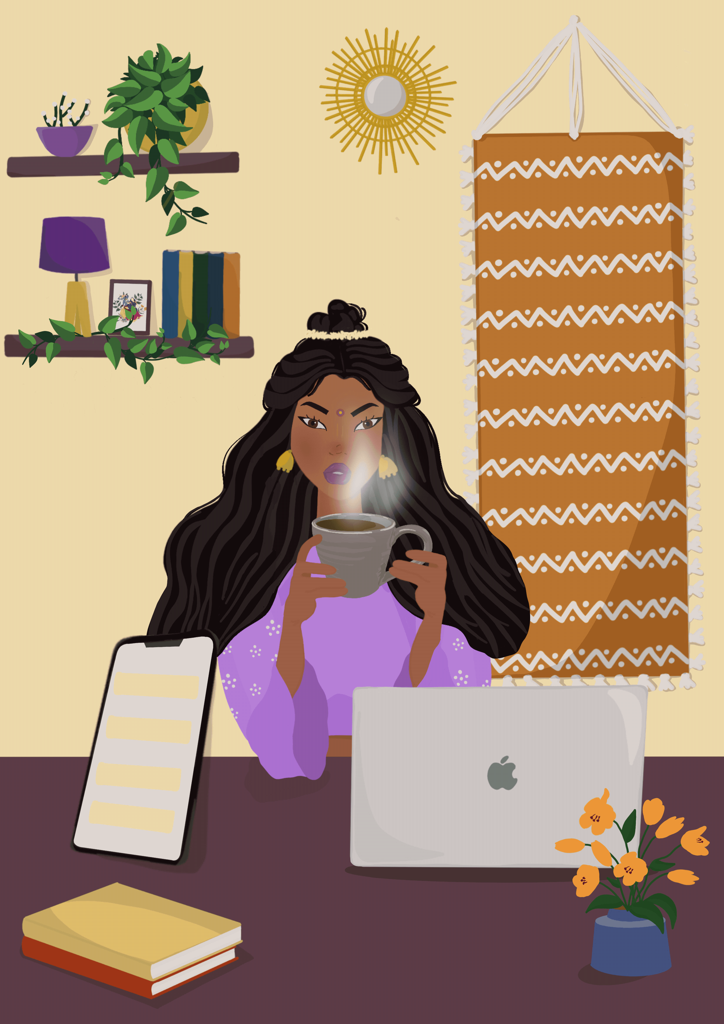 A woman sits at her desk with her laptop and coffee. Working, productive, handling life like anyone else.