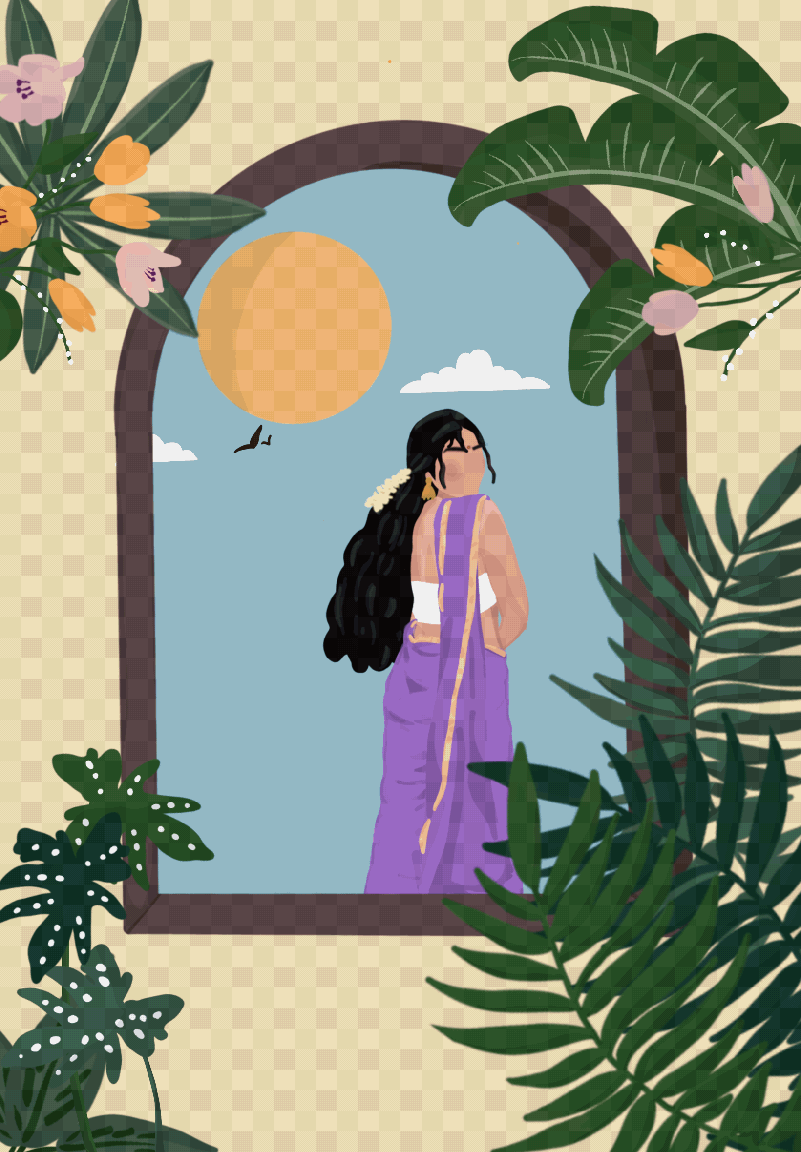 A woman stands in a sari before a window surrounded by lush greenery. She appears elegant and composed.