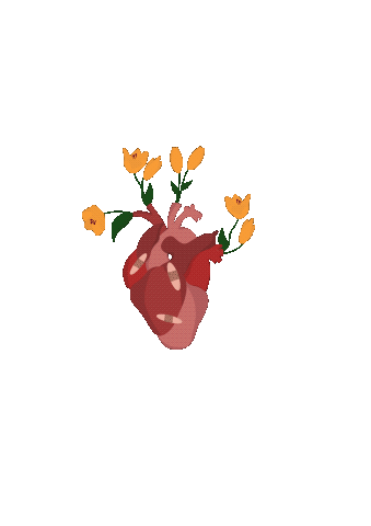 Behind her is a heart covered in bandaids with butterflies flying around it as you approach: healing is happening, but the wounds are still there.