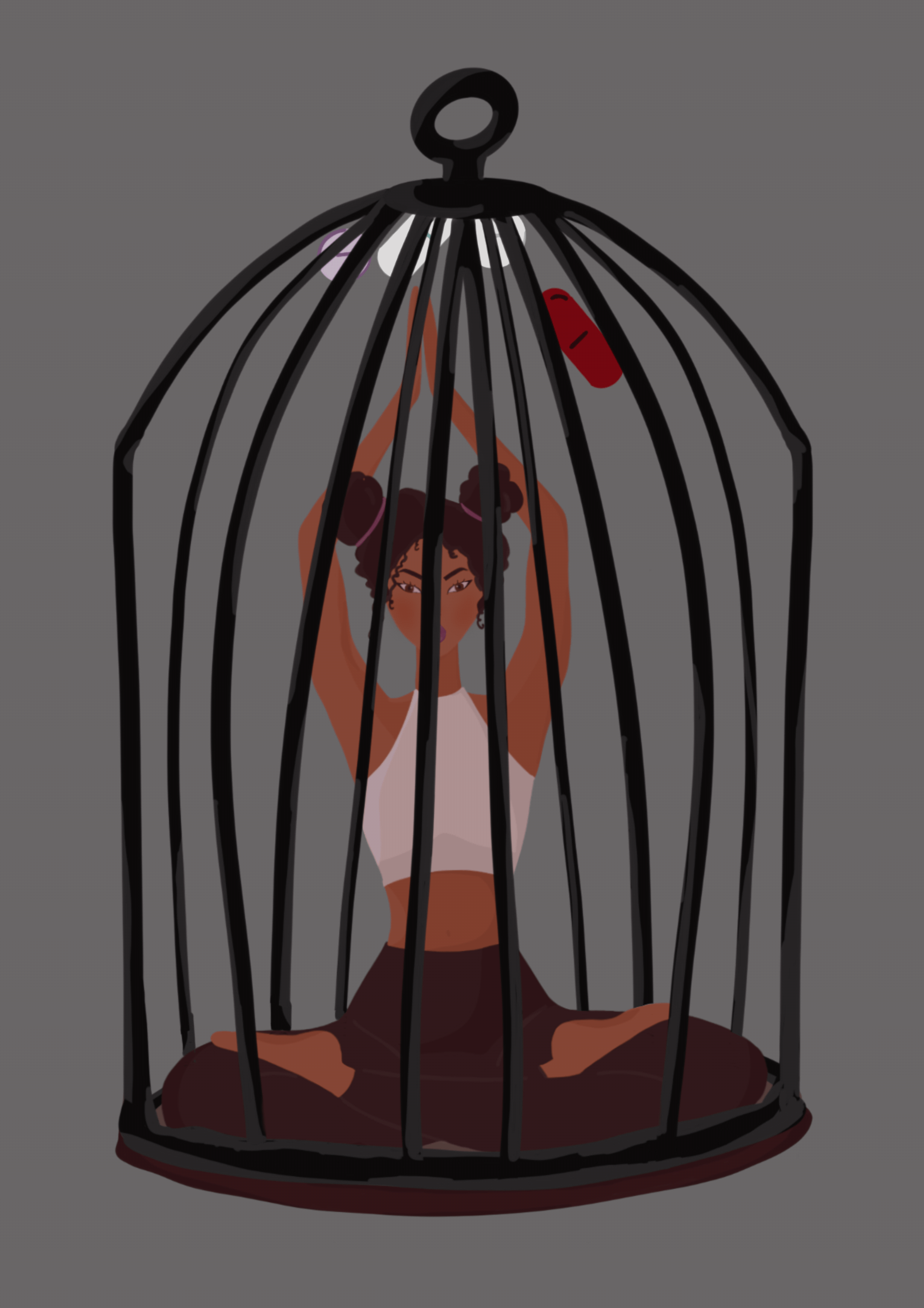 She's trapped in a cage with pills raining down. Another layer to the representation of how someone with a chronic illness feels trapped, controlled and dependent.
